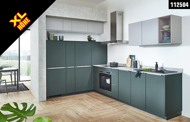 Ausführung: Moderne nobilia®-Winkelküche mit Fronten in Lacklaminat, Mineralgrün ultramatt und Lacklaminat, Taupegrau ultramatt / Xtra- Ceramic-Arbeitsplatte in Beton weiß Nachbildung