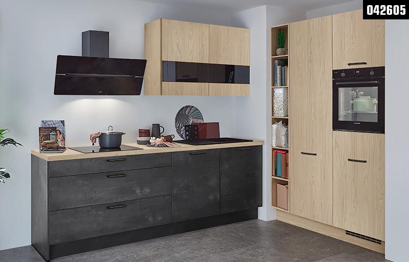Ausführung: Aktuelle nobilia®-Küchenkombination mit Fronten, Arbeitsplatte und Wandschränken in Eiche Como Nachbildung und Fronten in Schwarzbeton Nachbildung / Korpus in Schiefergrau