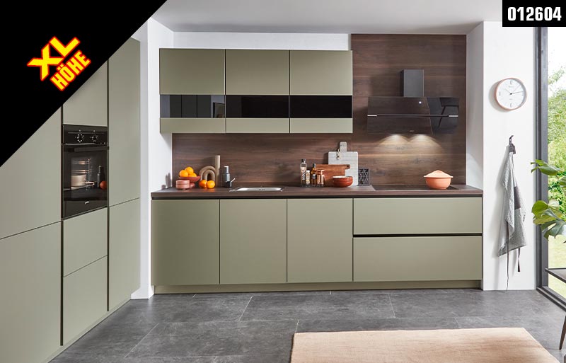 Ausführung: Grifflose nobilia®-Küchenkombination mit Fronten in Lack, Olive Premium matt / Arbeitsplatte und Nischenverkleidung in Walnuss natur Nachbildung / Korpus in Schwarz