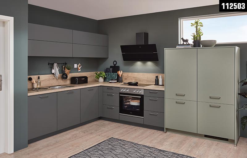 Ausführung: Moderne nobilia®-Winkelküche mit Fronten in Lack, Schiefergrau Premium matt und Lack, Olive Premium matt / Arbeitsplatte und Nischenverkleidung in Eiche Como Nachbildung / ohne Tisch und Stühle